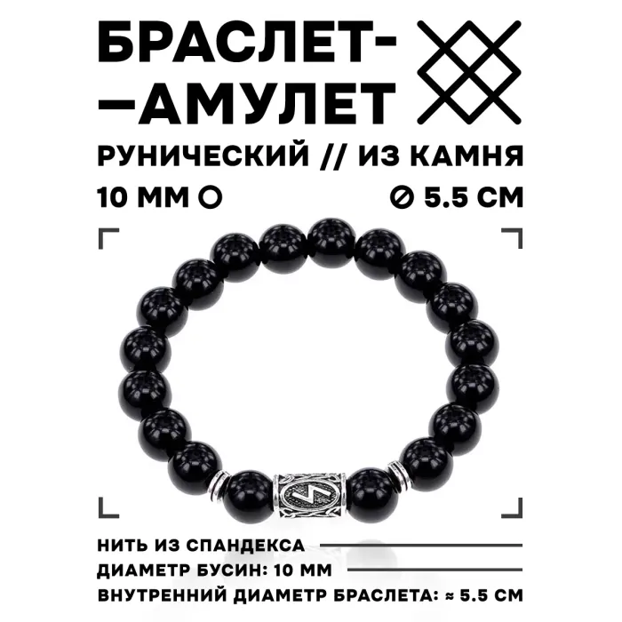 Браслет с руной Соулу и нат.камнем Черный агат 10 мм BSRC-01-23
