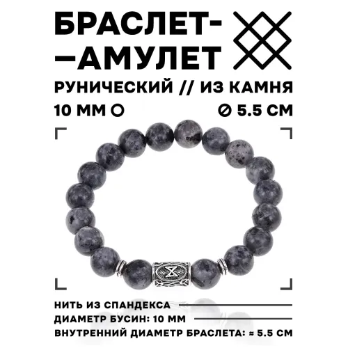 Браслет с символом руны Дагаз и натуральным камнем лабрадор. Дизайн включает бусины диаметром 10 мм.