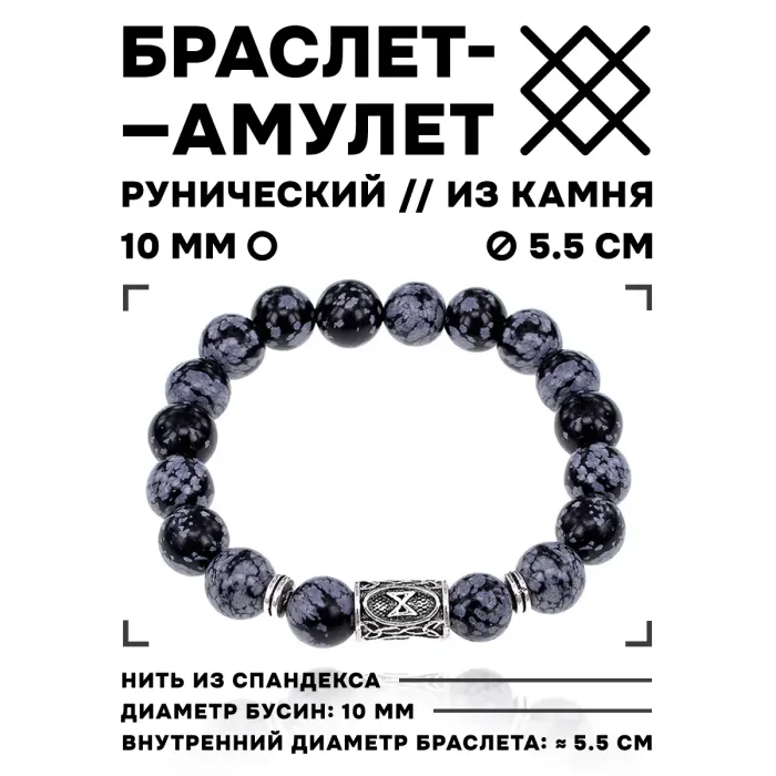 Браслет с руной Дагаз и нат.камнем Снежный обсидиан 10 мм BSRC-03-14