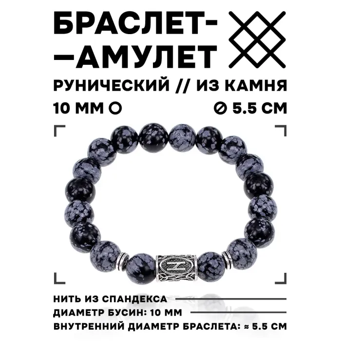 Браслет с руной Хагалаз и нат.камнем Снежный обсидиан 10 мм BSRC-04-14