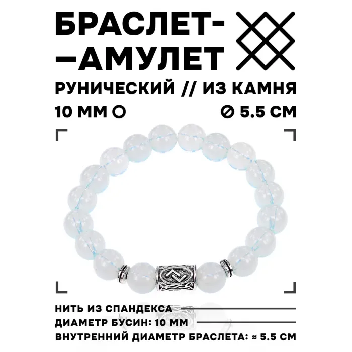 Браслет с бусинами из синтетического лунного камня и декоративным элементом в виде руны Йера.