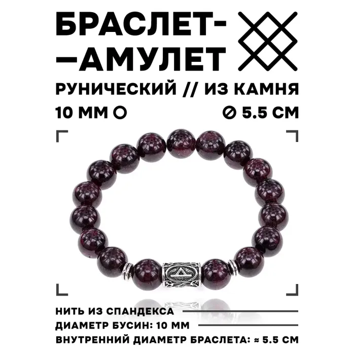 Рунический браслет с натуральным камнем гранат и символом руны Турисаз.
