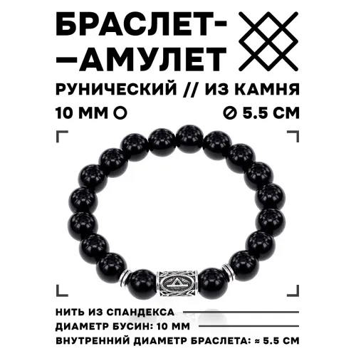 Браслет с руной Турисаз и натуральным камнем чёрный агат диаметром 10 мм.