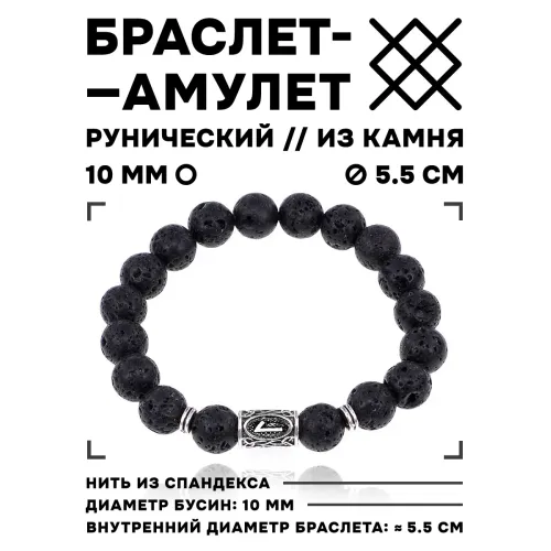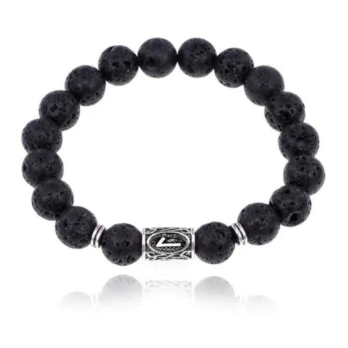 Браслет с руной Лагуз и натуральным камнем лавы диаметром 10 мм.