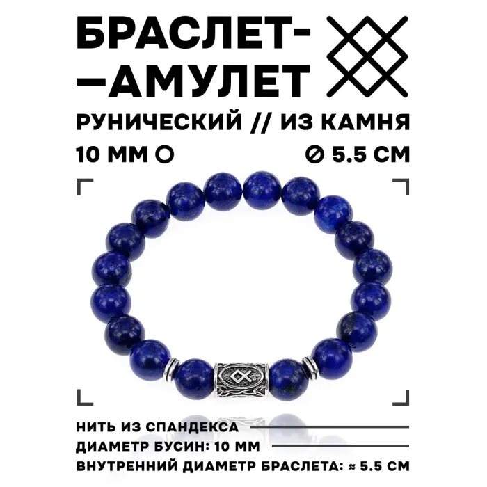 Браслет с руной Одал и натуральным камнем лазурит. Диаметр бусин 10 мм.