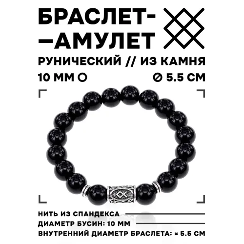 Стрейч-браслет с руной Одал и бусинами из натурального чёрного агата диаметром 10 мм.