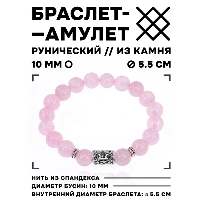 Браслет с руной Перт и натуральным камнем розовый кварц. Бусины диаметром 10 мм.