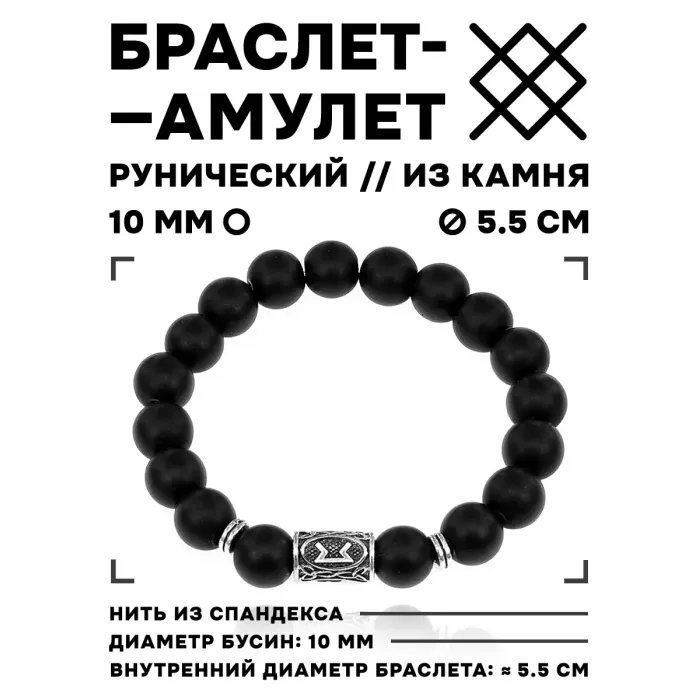 Браслет с руной Перт и синтетическим камнем шунгит. Дизайн включает бусины диаметром 10 мм.