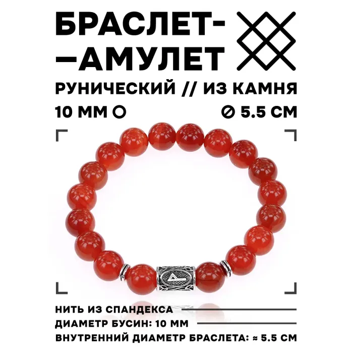Браслет с руной Вуньо из натурального сердолика диаметром 10 мм.