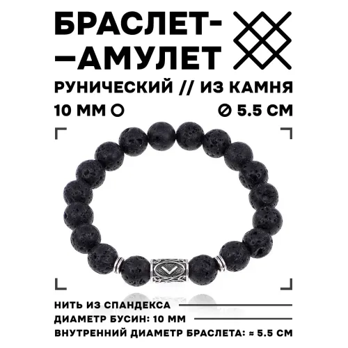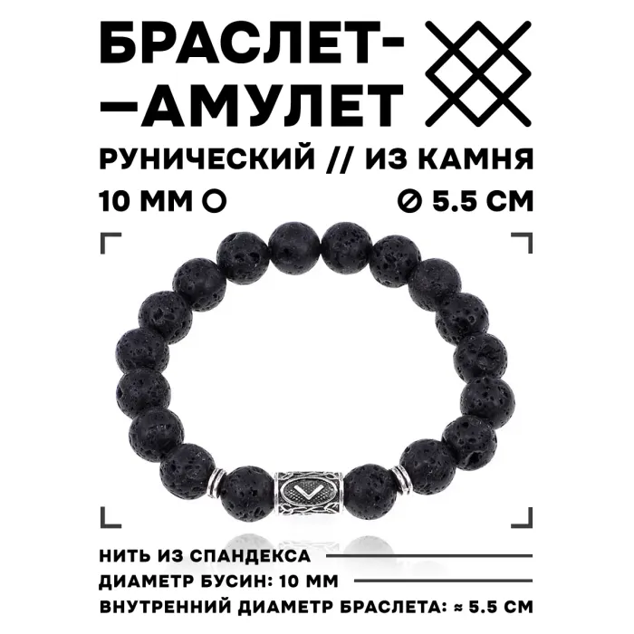 Браслет из натурального камня лава (базальта) с бусинами диаметром 10 мм и подвеской в виде руны Кеназ.