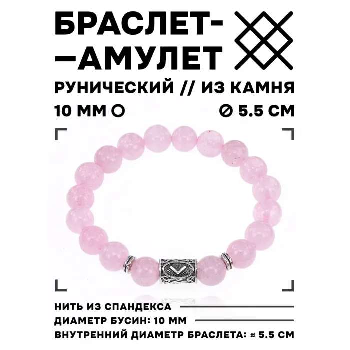 Браслет из натурального камня с символикой руны. Состоит из бусин розового кварца диаметром 10 мм и металлического кулона с руной Кеназ.