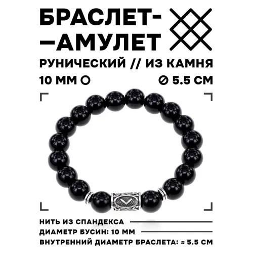 Браслет с руной Кеназ и натуральным камнем черный агат. Диаметр бусин 10 мм.