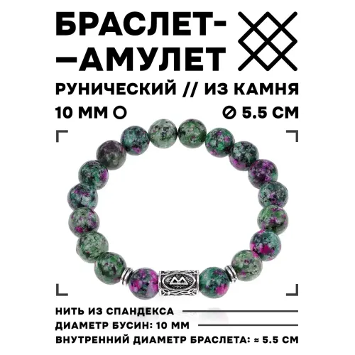 Браслет с руной Беркана и синт.камнем Цоизит 10 мм BSRC-21-22