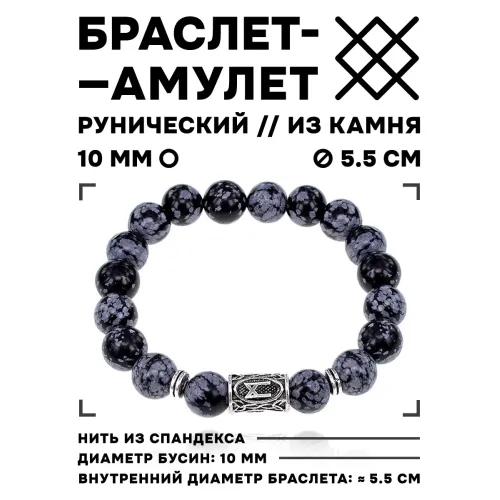 Браслет с руной Манназ и нат.камнем Снежный обсидиан 10 мм