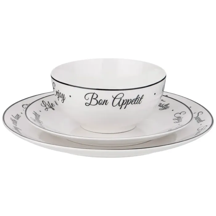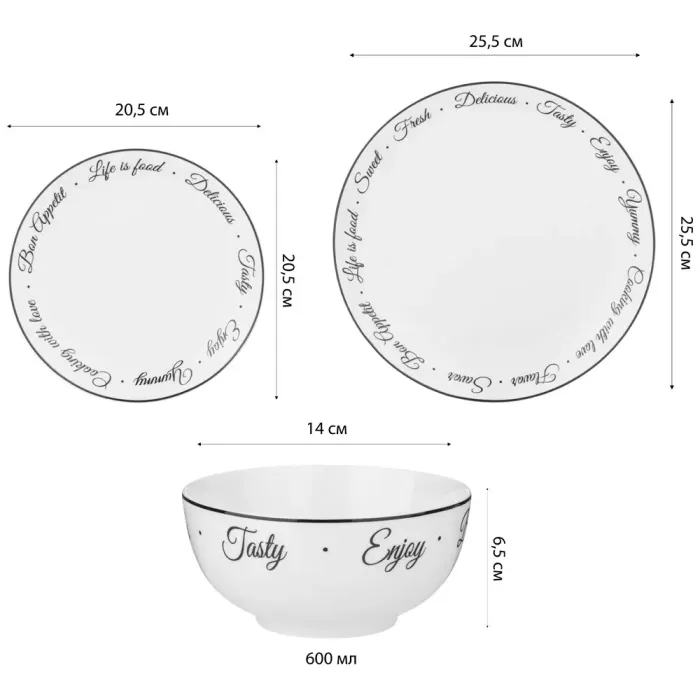 Набор изготовлен из фарфора, что обеспечивает прочность и устойчивость к царапинам. В комплект входят тарелки диаметром 14 см, 20,5 см и 25,5 см, что позволяет сервировать закуски, основные блюда и супы.