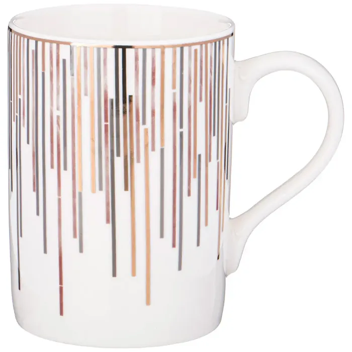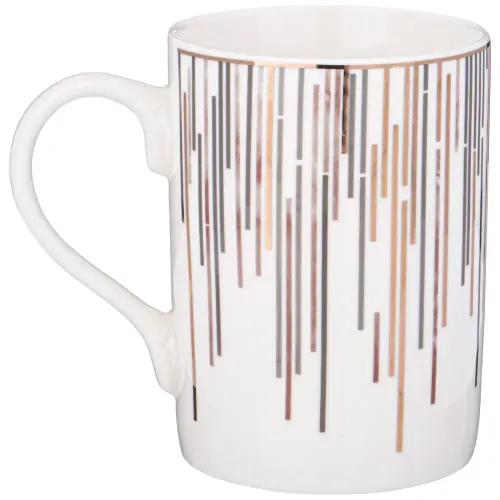 Кружка выполнена из упрочнённого фарфора, материала, отличающегося повышенной стойкостью к механическим воздействиям. Дизайн изделия включает декоративные элементы с золотым покрытием. Форма кружки прямолинейная, современная, с удобной ручкой.