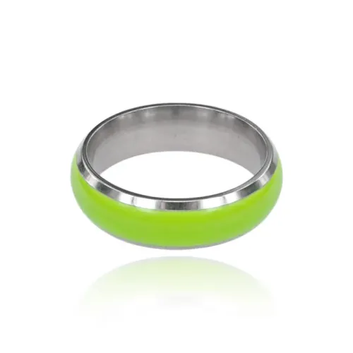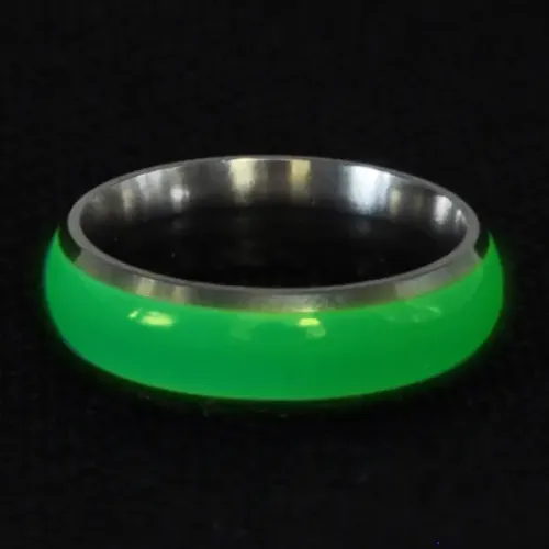 Светящееся кольцо зеленого цвета для ношения. Материал — металл с покрытием под серебро, обладает свойством свечения в темноте после зарядки на свету.