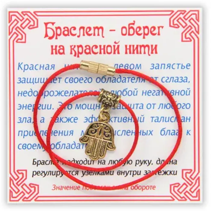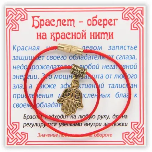 Браслет на красной нити Хамса — это стильный аксессуар с глубоким символическим значением. В восточной культуре Хамса считается оберегом, защищающим от негативных влияний и приносящим удачу. Изготовленный из шелковой красной нити, он украшен металлической подвеской, что придаёт ему элегантность и оригинальность.