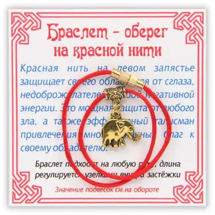 Браслет на красной шелковой нити с металлической подвеской в виде слона — символа удачи и благополучия. Этот стильный аксессуар не только подчеркнёт индивидуальность, но и станет отличным талисманом, который традиционно используется для привлечения счастья. Длина шнурка регулируется узелками внутри застежки-закрутки, что позволяет удобно носить браслет на любой руке. Упаковка в прозрачный пакетик с отверстием делает его идеальным подарком для близких.