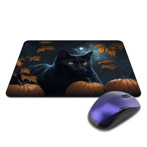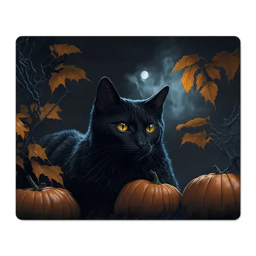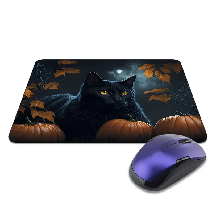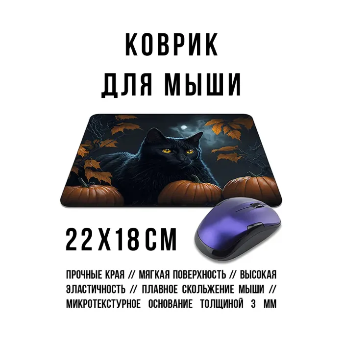 Коврик для компьютерной мыши с изображением чёрного кота в тематике Хэллоуина. Имеет прорезиненную основу.