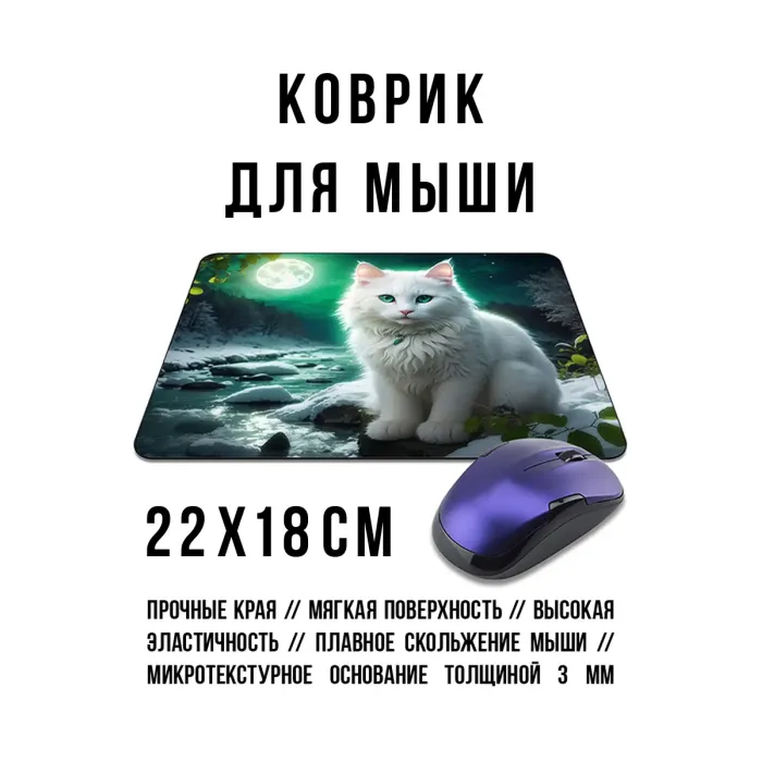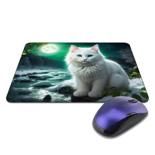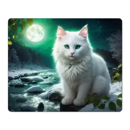 Коврик для мыши с изображением белой кошки на фоне полнолуния.