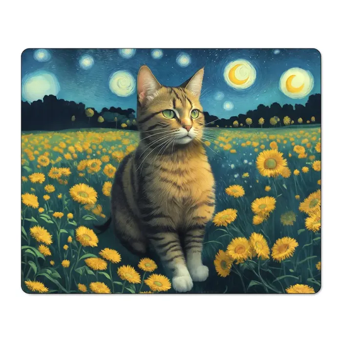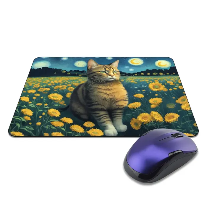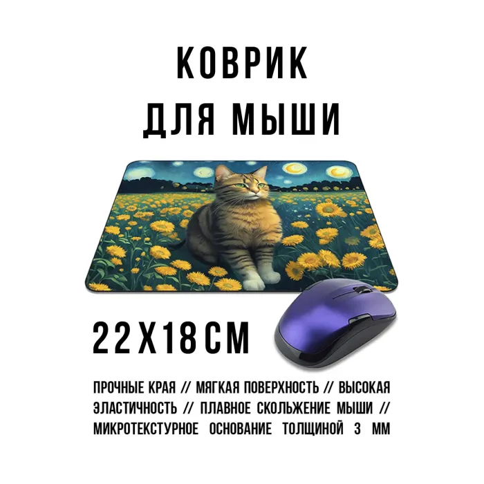 Коврик для мыши с изображением кота на фоне звёздной ночи. Имеет прорезиненную основу.