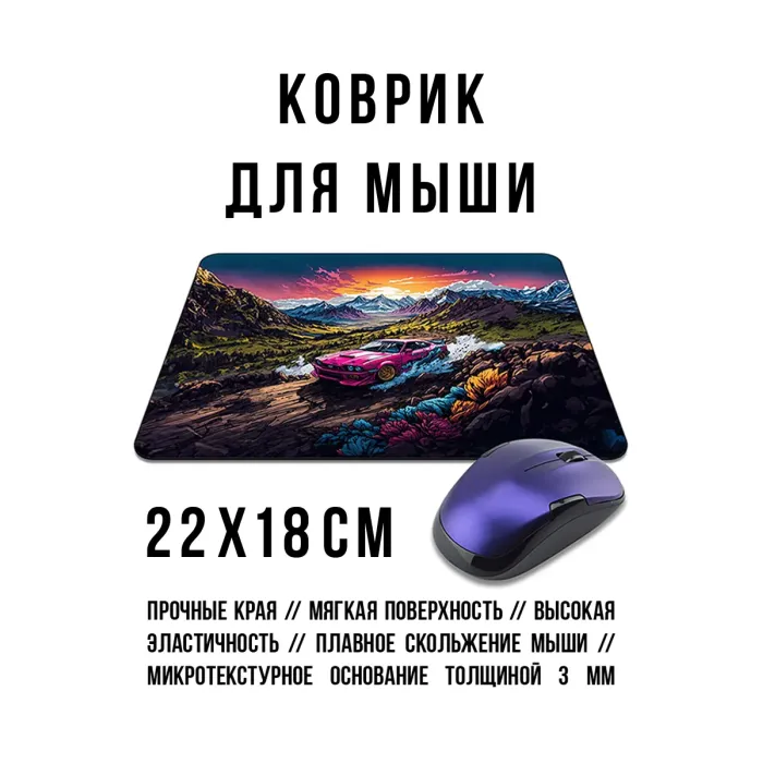 Коврик для мыши с изображением спортивного автомобиля — это стильное и практичное решение для любого компьютерного рабочего места. Прорезиненная основа обеспечивает надежную фиксацию на поверхности, а размер 22х18 см делает его компактным и удобным в использовании.