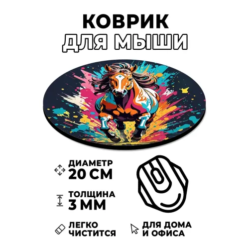 Коврик для компьютерной мыши с изображением "Конь в галопе" станет стильным дополнением рабочего места и подарит вдохновение во время работы или игры. Его диаметр составляет 20 см, а толщина — 3 мм, что обеспечивает комфортное использование. Изображение отличается стойкостью, четкостью и контрастностью, что делает коврик не только функциональным, но и привлекательным элементом декора. Благодаря качественным материалам обеспечивается хорошее скольжение мышки, что положительно скажется на производительности.