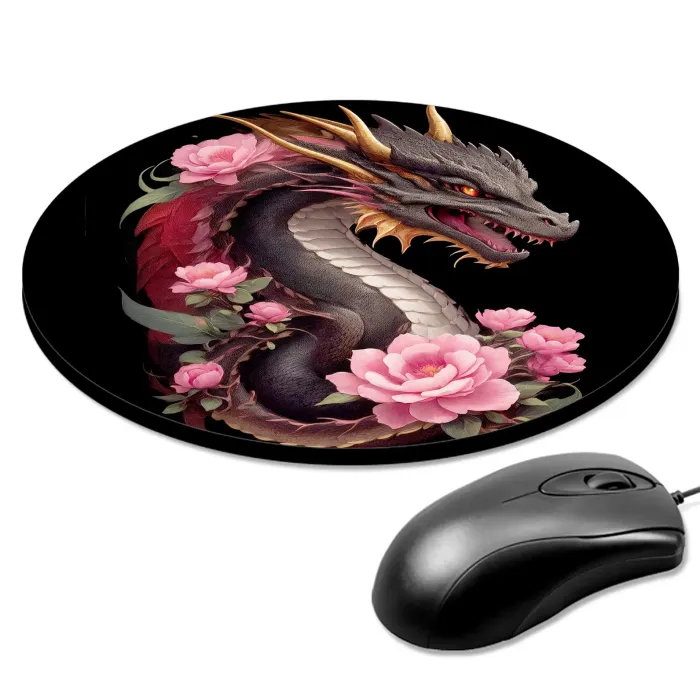 Коврик для компьютерной мыши круглой формы с изображением дракона и роз.