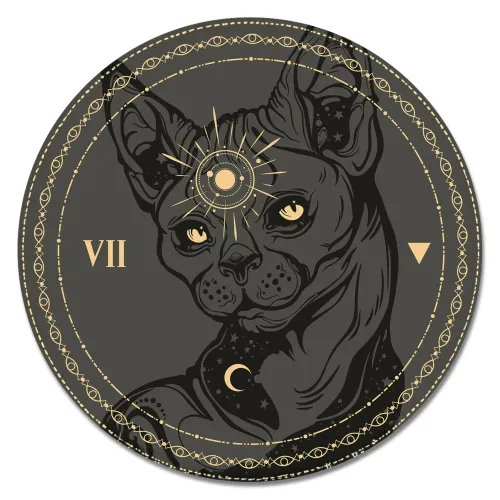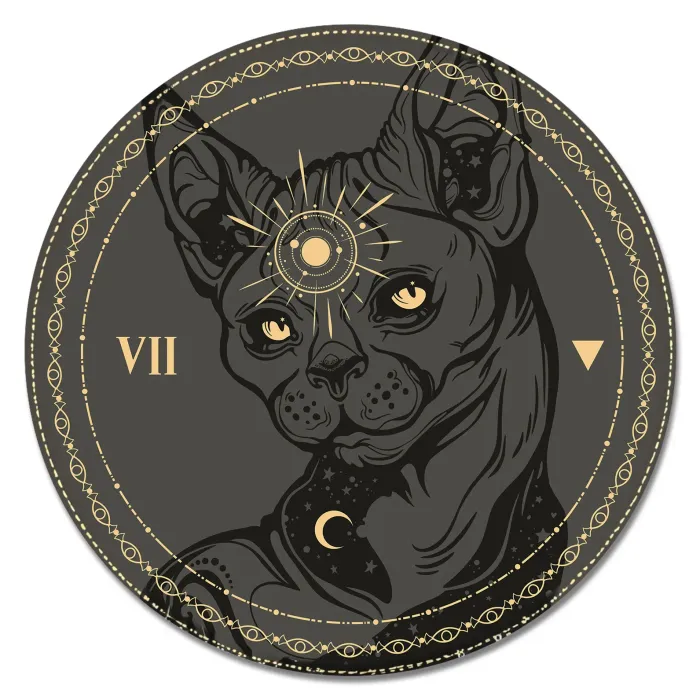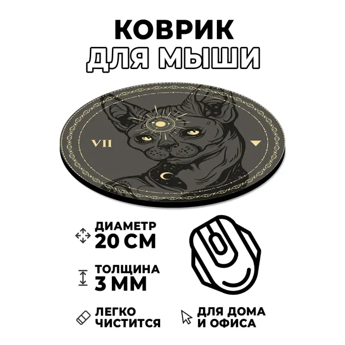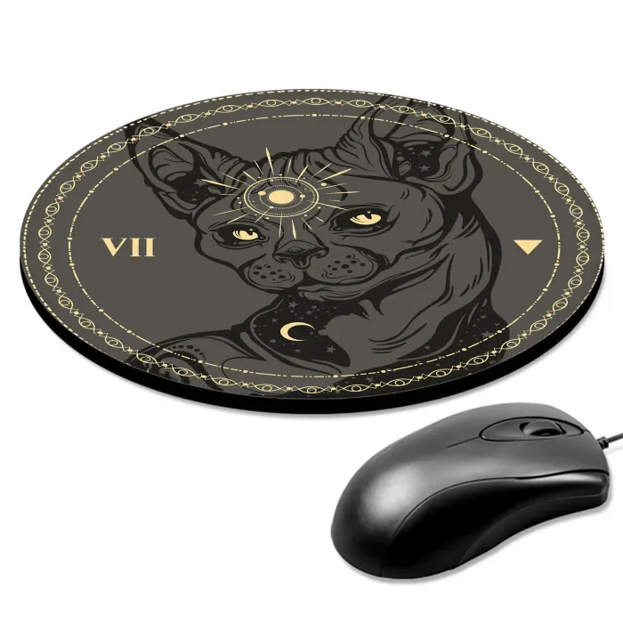 Коврик для компьютерной мыши круглой формы с изображением кота сфинкса.