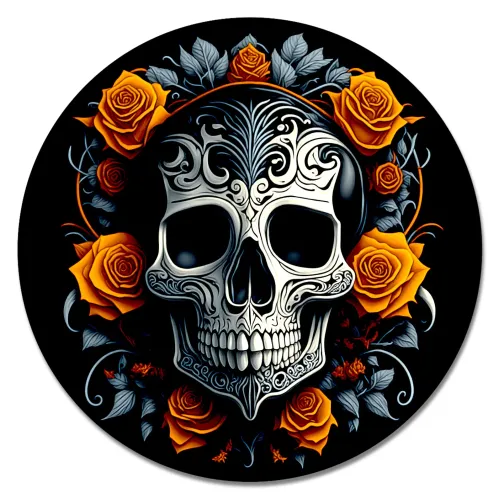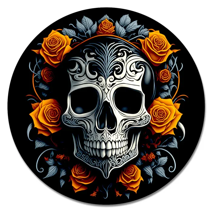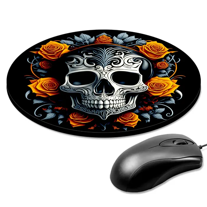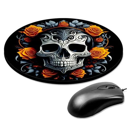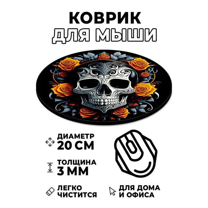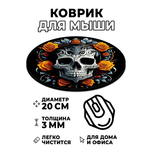 Коврик для компьютерной мыши с изображением черепа в цветах. Диаметр 20 см, толщина 3 мм.