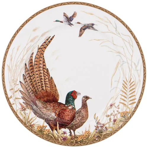 Для сохранения декора рекомендуется бережное мытьё. Тарелку можно комбинировать с другими предметами из коллекции Hunting для создания тематической сервировки. Классический дизайн с природными мотивами сочетается со стилями кантри, охотничьим или классическим интерьером.
