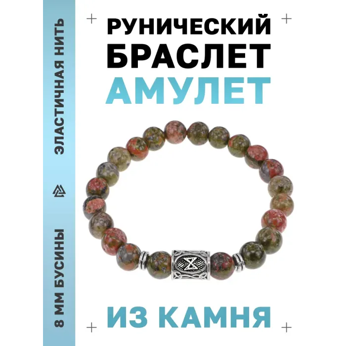 Материал и изготовление: Натуральный камень унакит, металлическая подвеска с символом руны.