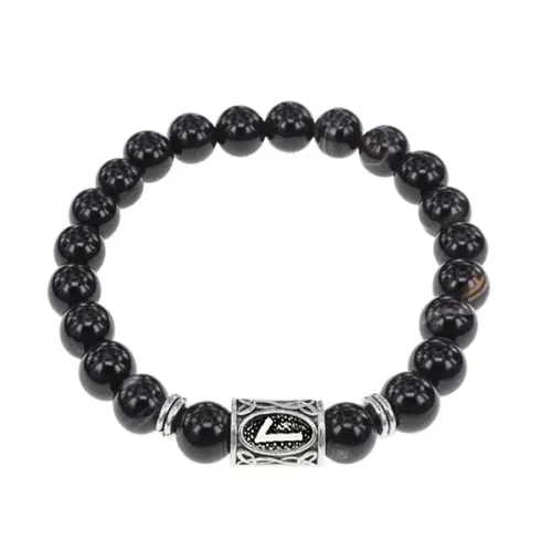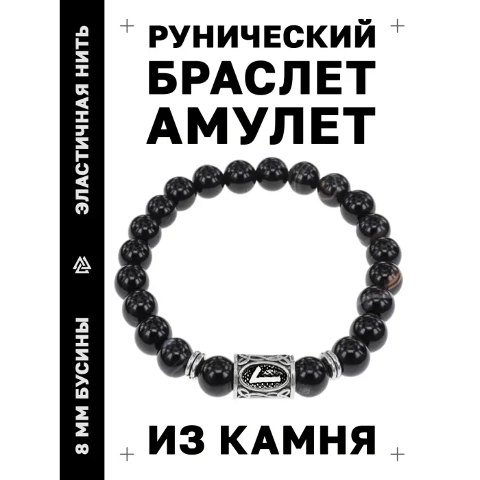 Стрейч-браслет из натурального черного агата с нанесенной руной Лагуз.