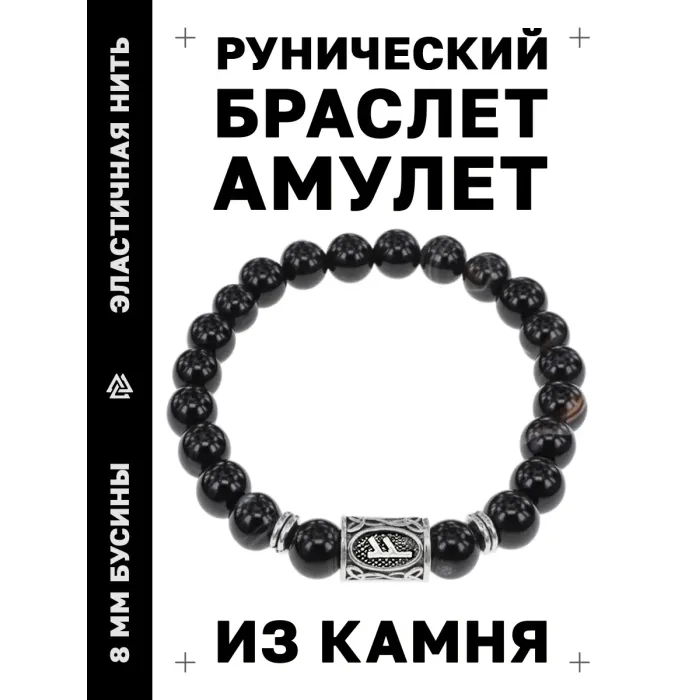 Браслет-сувенир с руной Феху и натуральным камнем черный агат. Модель на эластичной основе.