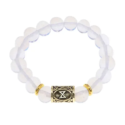 Браслет-стрейч с бусинами из синтетического лунного камня и символом руны Дагаз.