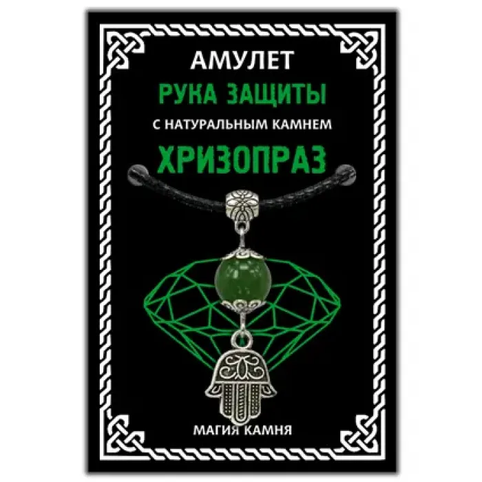 Амулет Рука защиты (Хамса) с натуральным камнем хризопраз — это символ благополучия и защиты. Хризопраз традиционно ценится за свои способности приносить успех и процветание, особенно новаторам и изобретателям. Он помогает противостоять зависти и клевете, а также отводит сглаз и защищает от недобрых людей.