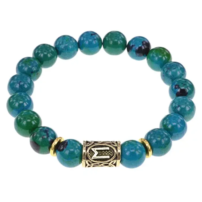 Браслет-сувенир с символом руны Эваз и синтетическим камнем хризоколла, выполненный в стрейч-дизайне.