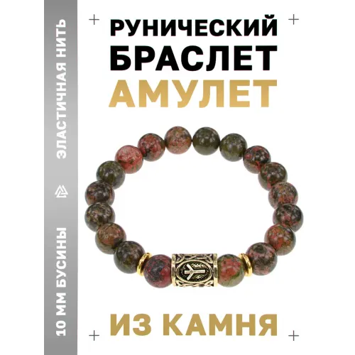 Браслет с символом руны Альгиз и натуральным камнем унакит. Стрейч-модель.