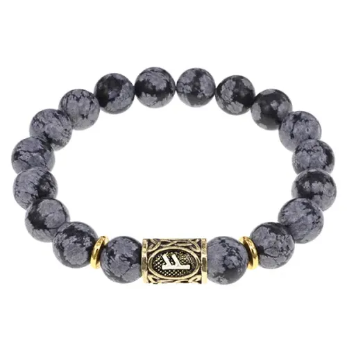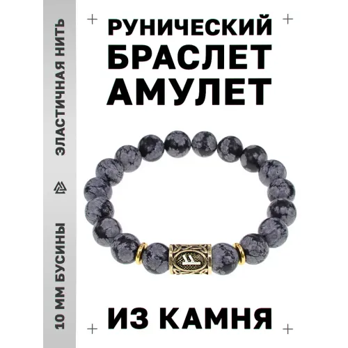 Браслет с символом руны Феху и натуральным камнем снежный обсидиан.