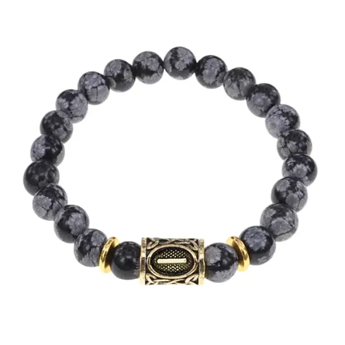 Браслет с символом руны Иса и вставкой из натурального камня снежный обсидиан.