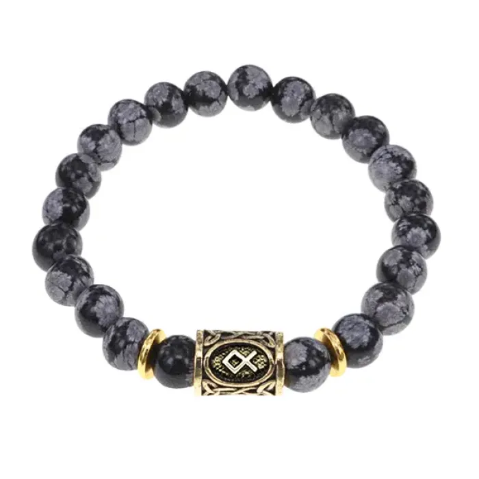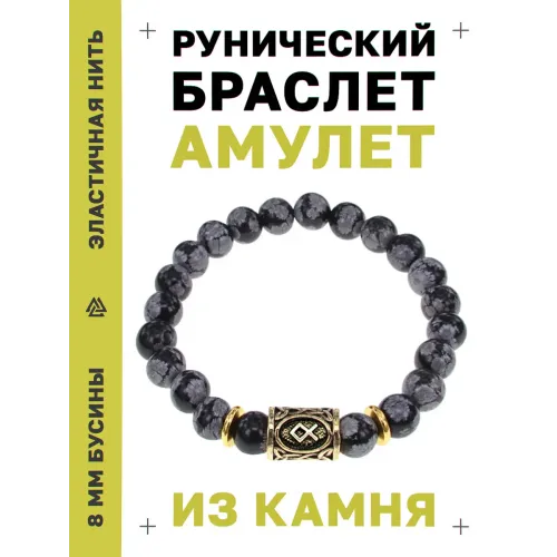 Браслет с руной Одал и натуральным камнем снежный обсидиан.