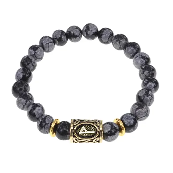 Браслет с символом руны Вуньо и бусинами из натурального снежного обсидиана.