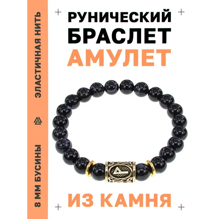 Браслет с символом руны Вуньо и бусинами из натурального чёрного агата.