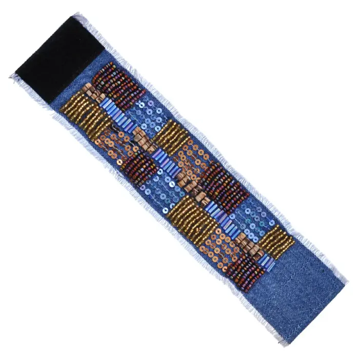 Джинсовый браслет с декоративными элементами из бисера и пайеток. Застёжка на липучке.
