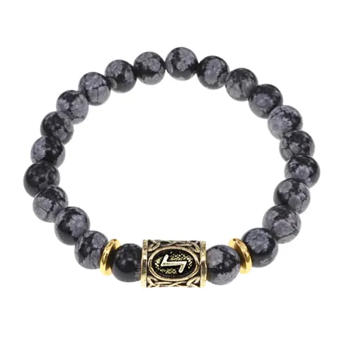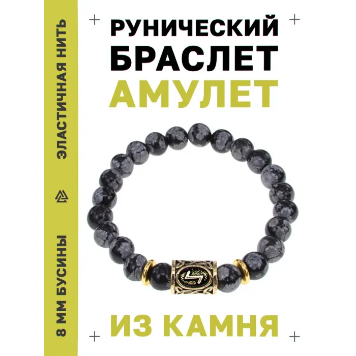 Стрейч-браслет с руной Эйваз и бусинами из натурального снежного обсидиана.