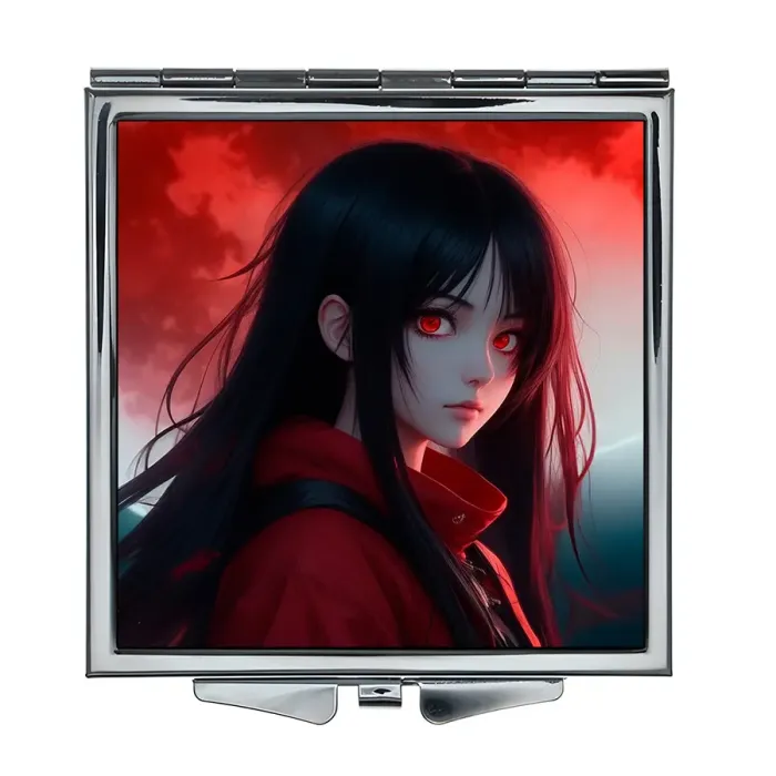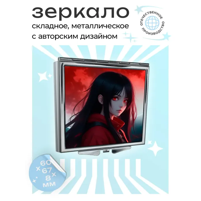 Складное зеркало квадратной формы с изображением аниме девушки. Изготовлено из металла и стекла.