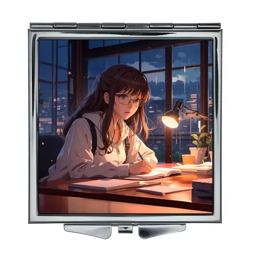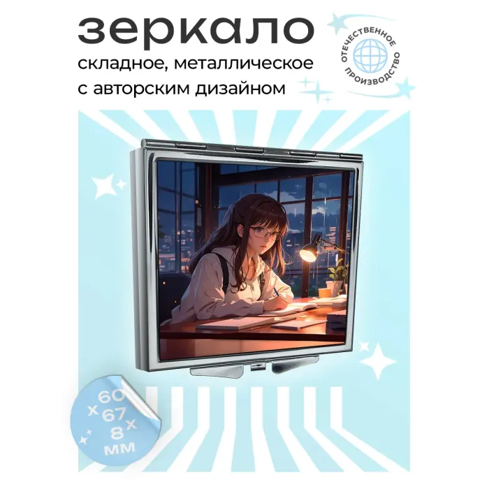 Складное квадратное зеркало с изображением аниме-девушки в очках. Изготовлено из металла и стекла.