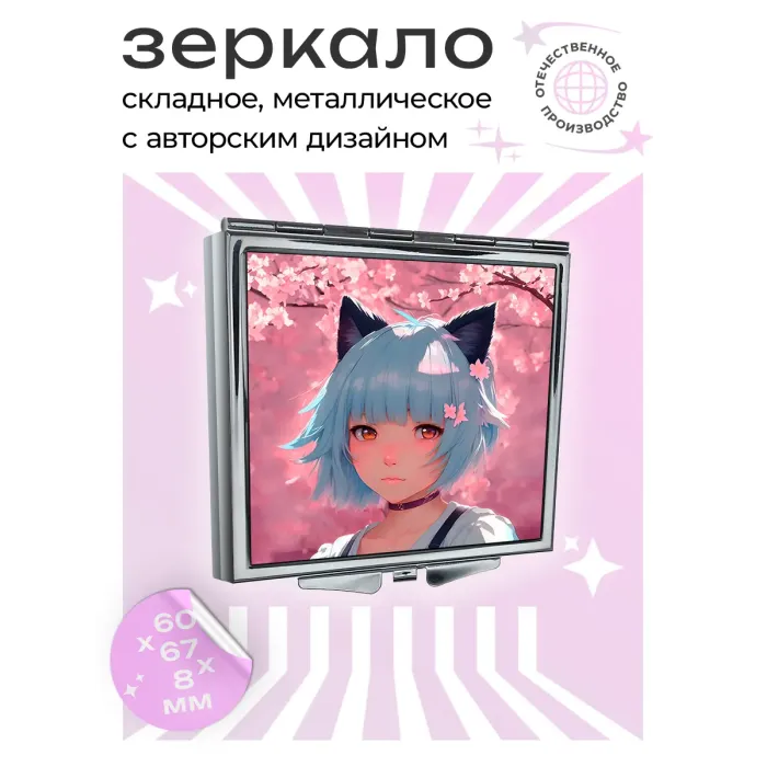Складное квадратное зеркало с изображением в аниме-стиле. Материал — металл и стекло.