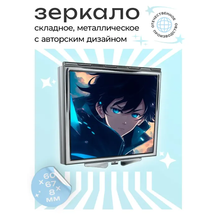Складное квадратное зеркало с изображением персонажа аниме. Материалы: металл и стекло.